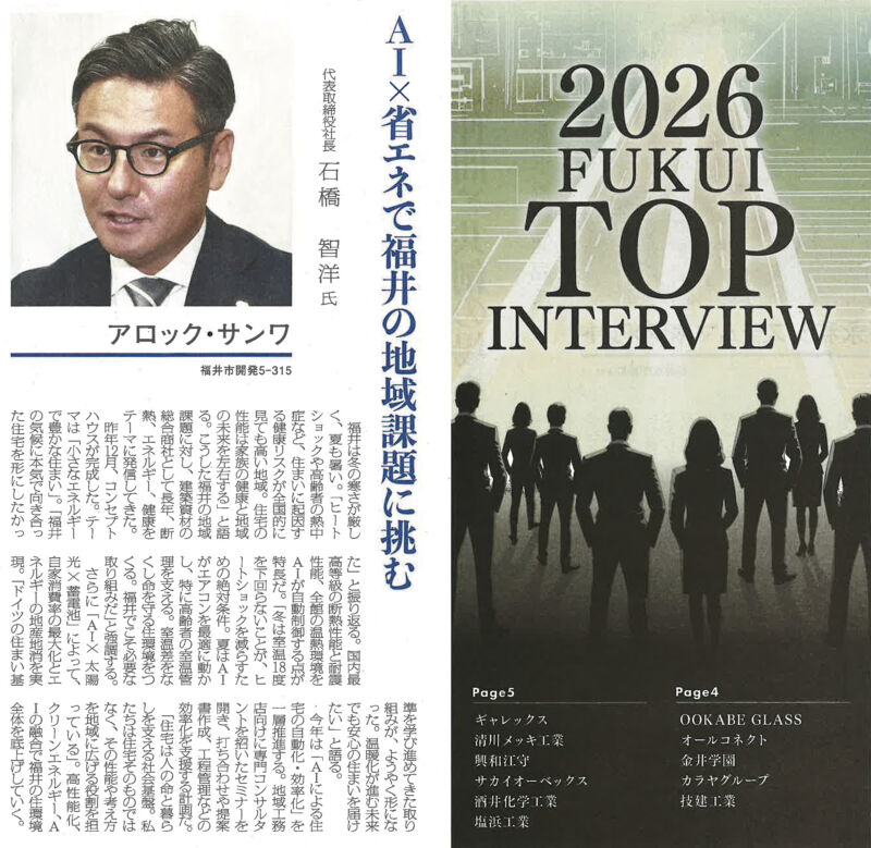 2026.01.01 福井新聞「トップインタビュー」に掲載されました 2026年1月1日発刊の福井新聞「トップインタビュー」に、社長石橋のインタビュー内容が掲載されました。 今回のキーワードは「AI×省エネ」。今後は住宅の消費エネルギー管理をAIに任せることで、より効率よく省エネを実現する方法を模索してまいります。